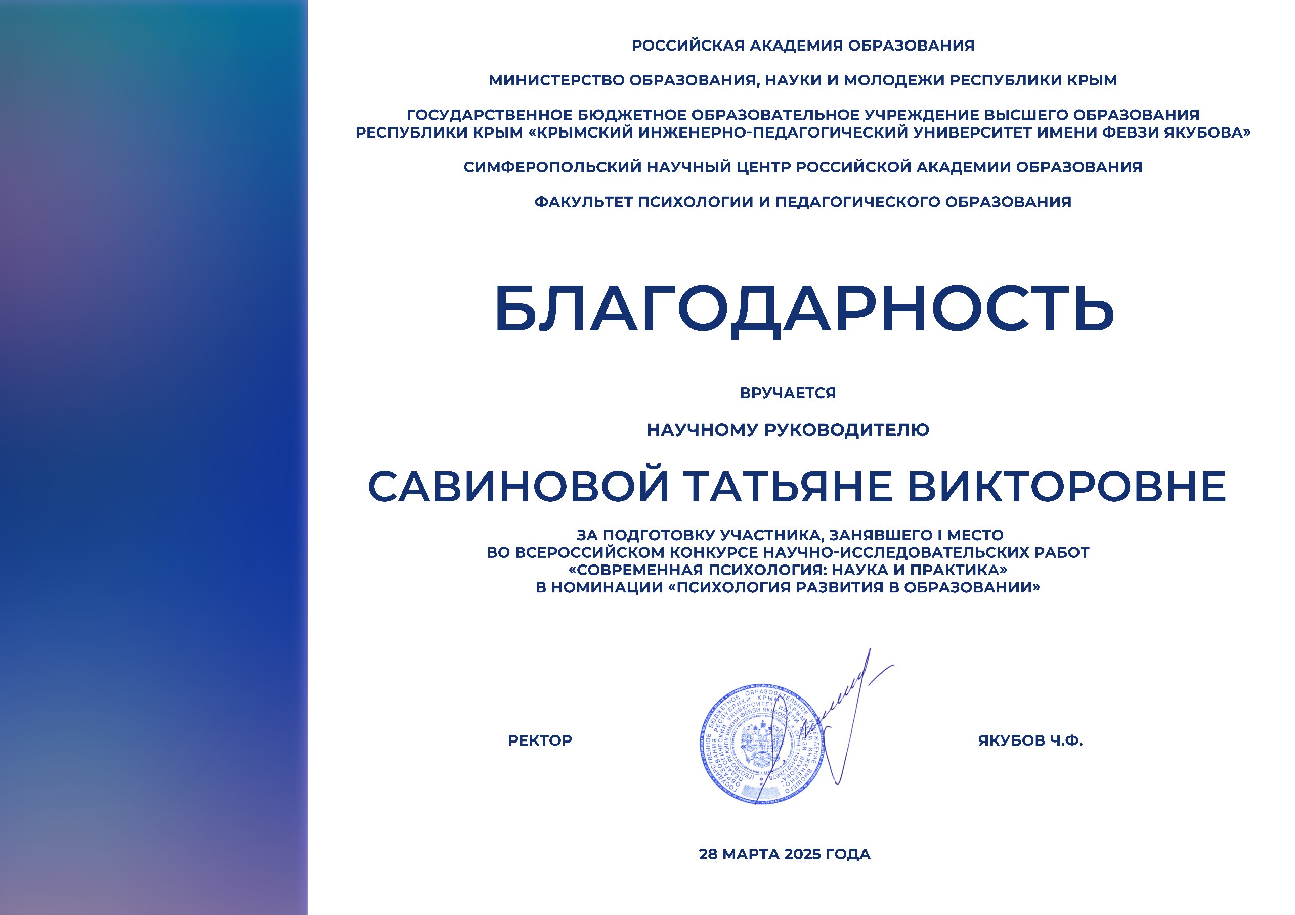 ЗАВЕРШИЛСЯ ВСЕРОССИЙСКИЙ КОНКУРС НАУЧНО-ИССЛЕДОВАТЕЛЬСКИХ РАБОТ «СОВРЕМЕННАЯ ПСИХОЛОГИЯ: НАУКА И ПРАКТИКА», организованный совместно Симферопольским научным центром Российской академии образования КИПУ имени Февзи Якубова и факультетом психологии и педагогического образования КИПУ имени Февзи Якубова.